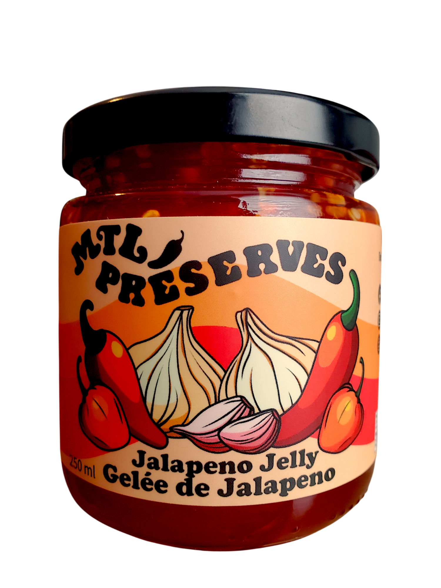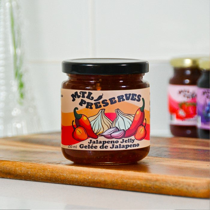 Gelée de jalapeño rouge assaisonnée de poudre d'ail et de poudre de habanero. Très épicée et très savoureuse, elle se combine bien avec tous les fromages ! C'est une excellente tartinade dans les sandwichs ou les hamburgers et peut être utilisée comme marinade pour les viandes et les poissons!